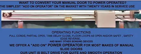 We offer an "Add On" Power Operator for most makes of manual slide doors. Our unit is belt drive for quiet and smooth operation.